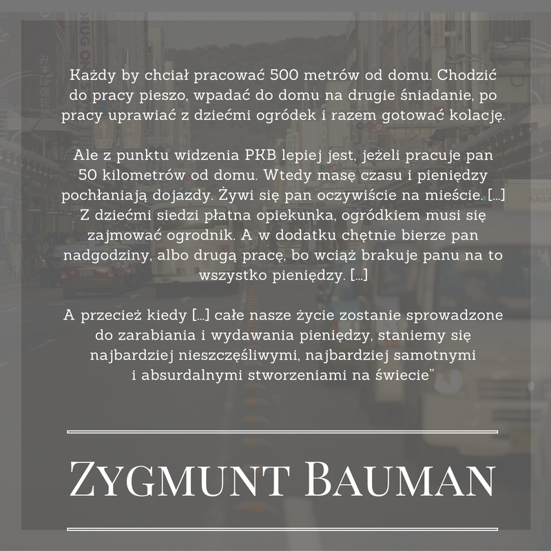 Ale z punktu widzenia PKB lepiej jest, jeżeli pracuje pan 50 kilometrów od domu. Wtedy masę czasu i pieniędzy pochłaniają dojazdy. Żywi się pan oczywiście na mieście. […] Z dziećmi siedzi płatna opiekunka, ogródkiem musi się zajmować ogrodnik. A w dodatku chętnie bierze pan nadgodziny, albo drugą pracę, bo wciąż brakuje panu na to wszystko pieniędzy. […]